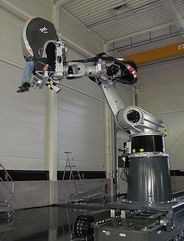 Five metres above the ground, Andreas Knoblach from the DLR Institute of Robotics and Mechatronics starts a virtual flight in the Robot Motion Simulator. The 10-metre-long track along which the robotic arm moves permits larger manoeuvres. The 'pilot' communicates with the team on the ground via radio and a camera. During the virtual flight he experiences the same forces as would affect his body during an actual flight.