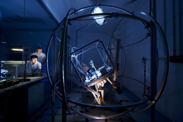 The most difficult condition to simulate is the force free rotation of the satellite body. This is difficult to achieve on the Earth’s surface since gravity always affects the satellite body. However, a trick is used to create realistic satellite motion on Earth: an air-bearing table.