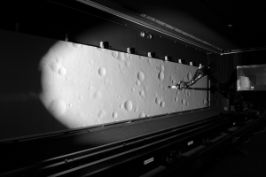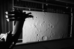 Model 2 has a size of 3.92 m x 1.96 m. It represents a part of the moon on a scale of 1:125000, its dynamic range is 20 cm. The model was produced with a milling accuracy of 1 mm. The reference data comes from the measurements of the Japanese Kaguya mission. With this model, park orbits and parts of the descent orbit can be simulated well. Unlike Model 1, Model 2 has the natural curvature of the moon; it has so far been used to simulate parts of the descent orbit to support the development of the crater navigation software in the DLR ATON project.