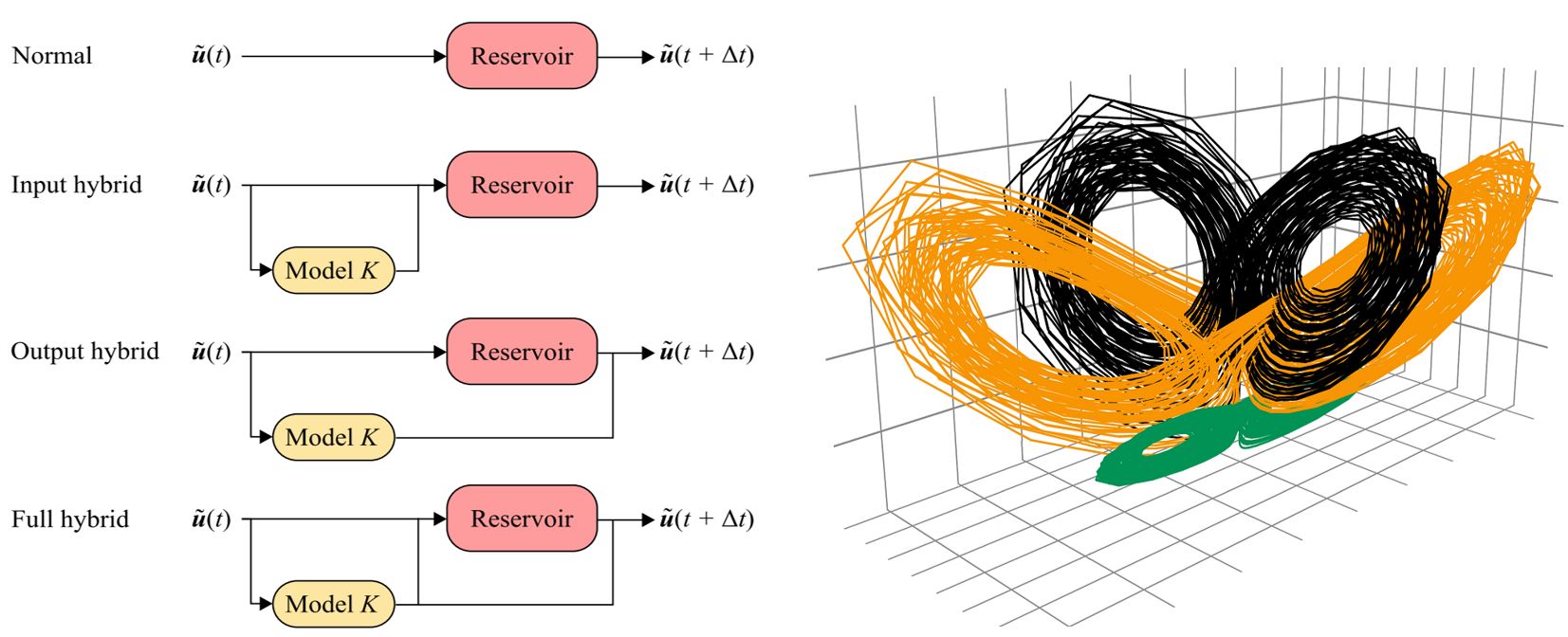 In the current work , different possible combinations (Fig. above/left: input hybrid, output hybrid, full hybrid) of the data-driven and model-based elements in hybrid RC were developed and tested for their goodness of fit. Using the chaotic model systems, it is shown that all hybrid approaches - no matter in which combination - significantly improve the prediction quality. The best results are achieved by combining data-driven and model-based predictions in the output layer of the recurrent neural network (output hybrid).