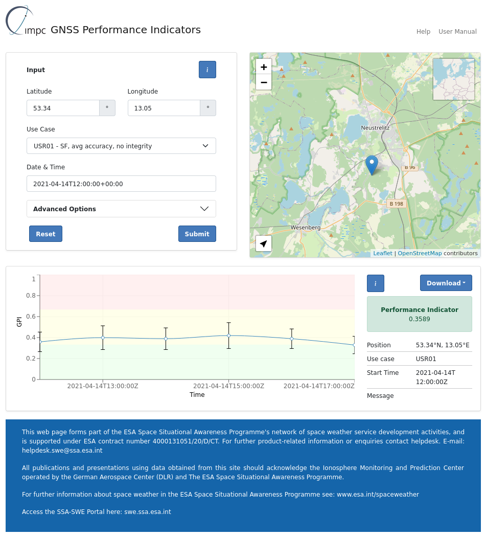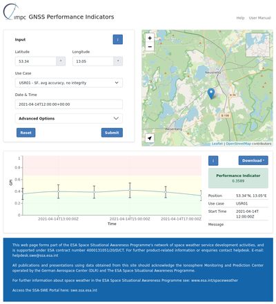 This product provides a user tailored GNSS performance indicator providing information on the expected impact of space weather on positioning at the user's location based on European (including high latitude) products together with global products distributed through the ESA SWE network available at swigpad.impc.dlr.de.