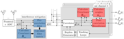 Dual-stage spatial signal processing. Pre-Correlation beamforming mitigates radio frequency interference (RFI) by placing spatial Nulls in the direction of an interferer.