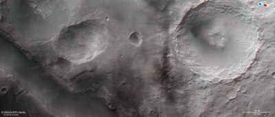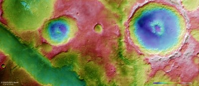 The colour image (image 1) was acquired using the nadir channel of the HRSC, which is directed vertically down onto the surface of Mars; the perspective oblique view (image 2) was computed from the HRSC stereo channels. The anaglyph image (image 3), which creates a three-dimensional impression of the landscape when viewed with red/blue or red/green glasses, was derived from the nadir channel and one stereo channel. The colour-coded aerial view (image 4) is based on a digital terrain model of the region, from which the topography of the landscape can be derived.