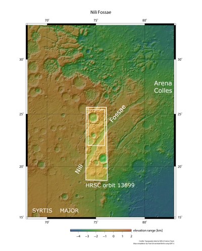 Nili Fossae caught the attention of astronomers in the last century, when Mars could only be observed from Earth with ground-based telescopes. The grabens of Nili Fossae extend for several hundred kilometres along the eastern edge of the giant impact basin Isidis Planitia and, together with the volcanic region Syrtis Major, they form a concentric pattern that runs parallel to the edge of the basin. Instruments on board current Mars orbiters have revealed a very varied and unusual mineralogy. The High Resolution Stereo Camera (HRSC) operated by the German Aerospace Center (Deutsches Zentrum für Luft- und Raumfahrt; DLR), which is part of the instrument suite on board the ESA Mars Express spacecraft, imaged Nili Fossae on 16 October 2014.