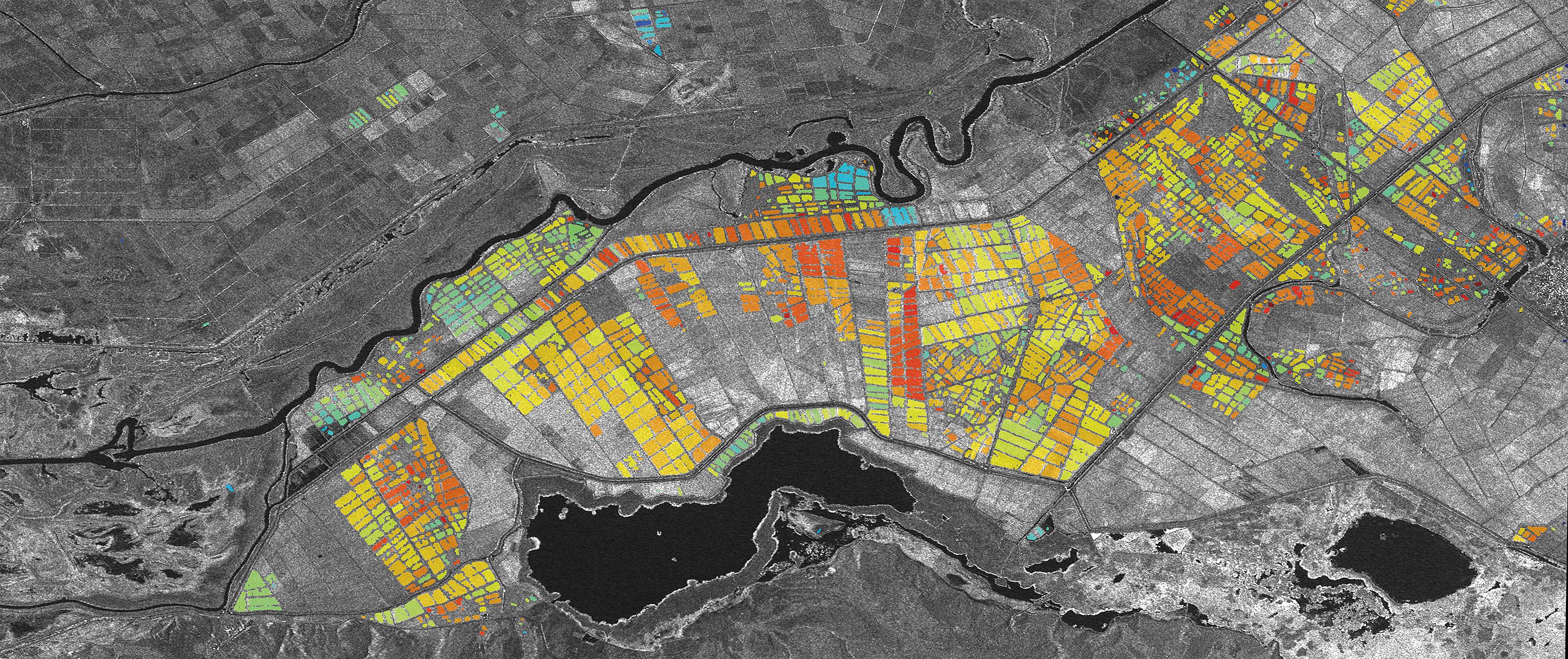 Broad rice growing areas stretch across the region around Lake Gala in southwestern Turkey. The German TanDEM-X radar satellite provides data precise enough to observe the growth in individual rice fields, from the start of the vegetative stage, through the ripening phase, until harvest time. The various colours of the fields in the image represent the different heights of the plants. The measured height ranges from a few to 20 centimetres. This information is used, among other things, to precisely predict the time at which the crop should be harvested.