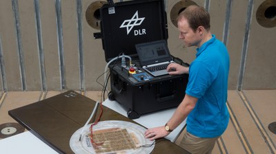 With the support of DLR Technology Marketing, the researchers in Stuttgart have developed a mobile repair station that can be used to demonstrate the process. It includes all the systems required for repairing FRP structures. In addition to the equipment for inductive heating of the metal sheet, it has a vacuum pump for generating the required pressure on the patch. The individual processes can be controlled via a netbook using temperature sensors.