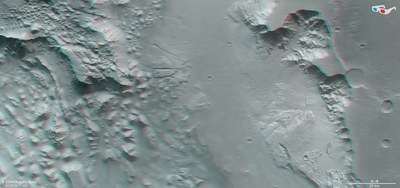 The images were acquired by the HRSC (High Resolution Stereo Camera) on 16 July 2015 during Orbit 14,653 of the Mars Express spacecraft, at 320 degrees east and 8 degrees south. The image resolution is approximately 17 metres per pixel. The colour image (image 1) was acquired using the nadir channel of the HRSC, which is directed vertically down onto the surface of Mars; the perspective oblique view (image 2) was computed from the HRSC stereo channels. The anaglyph image (image 3), which creates a three-dimensional impression of the landscape when viewed with red/blue or red/green glasses, was derived from the nadir channel and one stereo channel. The aerial view encoded in rainbow colours (image 4) is based on a digital terrain model of the region, from which the topography of the landscape can be derived.