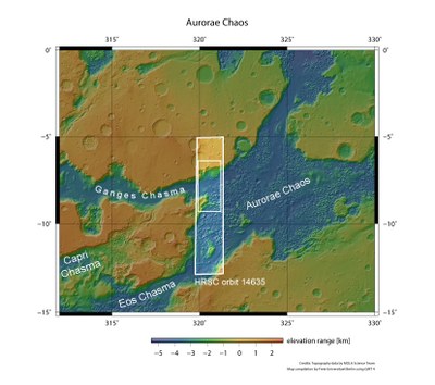 The region portrayed in the image shows numerous interesting landscape features that point to large amounts of water flowing across the Martian surface in the past. Chaotic terrains are believed to have developed by collapse, triggered by the sudden release of water when giant subterranean ice reservoirs melted. The source of the heat could be nearby volcanoes or an asteroid impact. When the water drains away, the surface falls over the newly formed cavities and the landscape collapses onto itself. A close look at the topographic map reveals that the high plateaus to the north and south of Aurorae Chaos are approximately the same height. The southern plateau (top left in the plan views) shows a field of mountains with rounded peaks, a small, chaotic terrain located several thousand metres up as well as numerous buttes smaller than those in the valley and that have not been worn by erosion. The northern plateau does not show traces of an eroded landscape. Some smaller branching channels can be seen on the surface. Therefore, water was possible present in the subsoil in the south but not in the north.