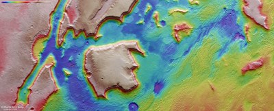 The HRSC system acquired these images on 7 July 2015 from an altitude of approximately 360 kilometres during Mars Express orbit number 14,605. The data was processed by scientists from DLR and the Planetary Sciences and Remote Sensing Department at Freie Universität Berlin. The region is located at five degrees south and 146 degrees east. The image resolution is approximately 15 metres per pixel. The colour plan view (image 1) was produced by the nadir channel, which is directed vertically down onto the surface of Mars, along with the colour channels; the oblique perspective image (image 2) was calculated using data acquired by the HRSC stereo channels. The anaglyph image (image 3), which conveys a three-dimensional impression of the landscape when viewed through red-blue or red-green spectacles, was composed using data acquired by the nadir channel and one stereo channel. The colour-coded plan view (image 4) is based on a digital model of the regional terrain, from which the landscape topography can be derived.