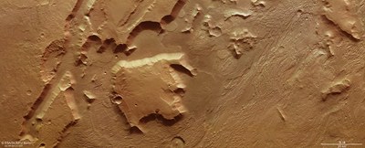 Numerous fracture zones known as tectonic grabens cross the region. Expansion of the Martian crust produced a large number of freestanding mesas (sometimes called witness buttes), the plateaus of which indicate that the highlands of Mars once extended further to the north. A large expansion fracture extends diagonally through the image in the south of this scene, on the left-hand side of the image (north is on the right in these images). The large mesa in the centre of the image, which measures approximately 40 by 40 kilometres and rises some 2500 metres above the surrounding terrain, is a remnant of these expansion processes. Its top is at the same elevation as the adjacent Hesperia Planum highland region further to the south.