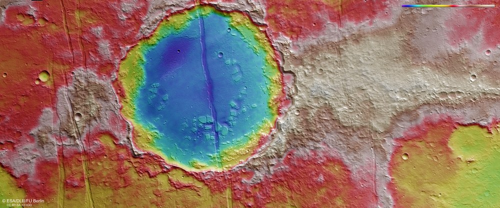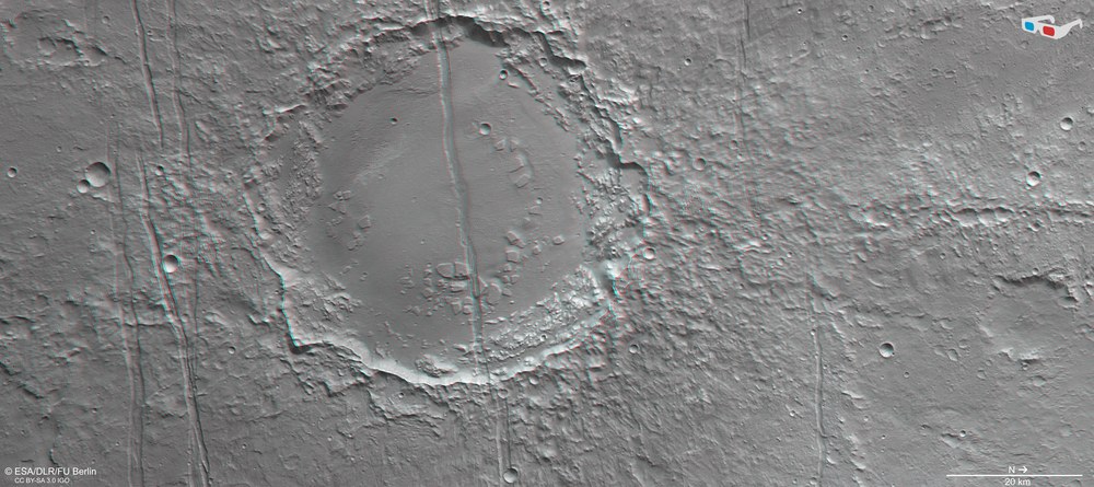 Also prominent are a number of striking mesas that project several hundred metres above the level crater floor. The larger ones are up to 2.5 kilometres across. Their arrangement is somewhat reminiscent of many other 'chaotic terrains' on Mars – regions characterised by intense erosion. However, this small chaotic region, which appears to be the result of the crater being refilled with lava that presumably came from the deep rift, stabilised and hence protected the mesas from further erosion.