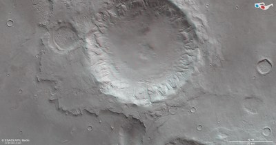 These images, acquired by the High Resolution Stereo Camera (HRSC) operated by the German Aerospace Center (Deutsches Zentrum für Luft- und Raumfahrt; DLR) on board the European Mars Express spacecraft show a part of the Noachis Terra region in the southern highlands of Mars. The crater shown is approximately four kilometres deep and has a diameter of roughly 50 kilometres. It has a central depression and drainage valleys at the crater rim. These structures indicate the presence of ice in the subsurface. An unusual dune field reveals that, at present, atmospheric processes shape the landscape.