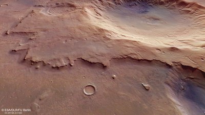 The High Resolution Stereo Camera (HRSC) acquired these images during Mars Express Orbit 14,680 on 29 July 2015. The centre of the image lies at 37 degrees east and 35 degrees south. The image resolution is about 14 metres per pixel. The colour plan view was acquired using the nadir channel of the HRSC, which is directed vertically down onto the surface of Mars; the perspective oblique view (image 2) was computed using data acquired by the HRSC stereo channels. The anaglyph image (image 3), which creates a three-dimensional impression of the landscape when viewed with red/blue or red/green glasses, was derived from the nadir channel and one stereo channel. The colour-coded aerial view (image 5) is based on a digital terrain model of the region, from which the topography of the landscape can be derived.