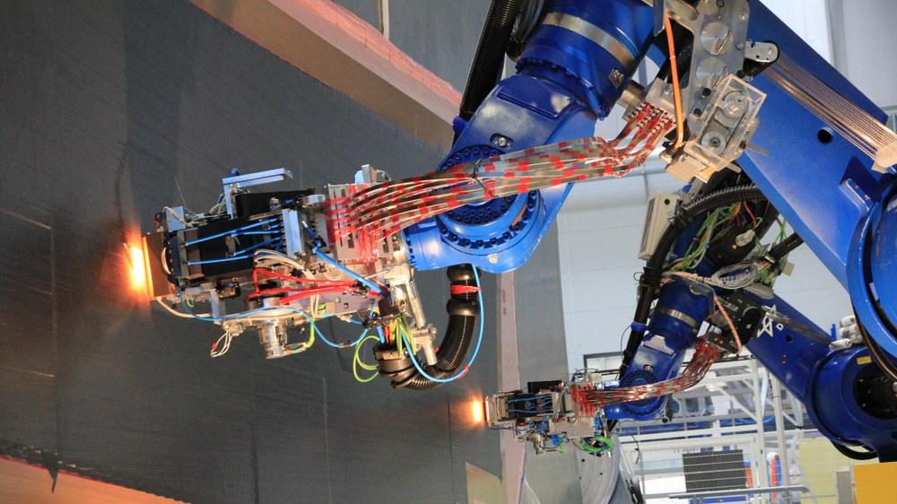 Lightweight and therefore kerosene-saving wings made from carbon fibre reinforced plastic (CFRP) are already being used in the quiet, fuel-efficient flagship Airbus A350. But production has been extremely expensive and time-consuming thus far, because only one robotic laying unit stacks carbon fibres layer by layer, until a wing shell is formed. Even in three-shift operation, this takes up to seven days and slows down a new aircraft's entire production process. Scientists at the Center for Lightweight-Production-Technology (ZLP) at the German Aerospace Center (Deutsches Zentrum für Luft- und Raumfahrt; DLR) in Stade have now demonstrated how two robots working in parallel without colliding can halve the production time.