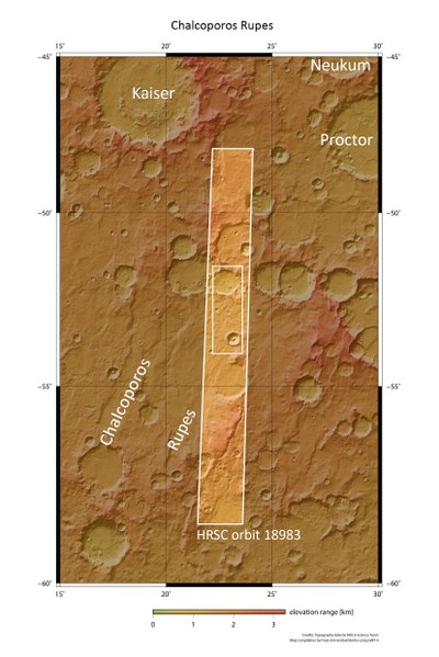 Mars Express, the first planetary mission undertaken by ESA, has been orbiting Earth's neighbouring planet for more than 15 years and will soon have circled Mars 20,000 times. HRSC has imaged a section of the Martian surface on roughly every third to fourth orbit of Mars. Systematic processing of the camera data is carried out at the DLR Institute of Planetary Research in Berlin-Adlershof. From this data, staff specialising in planetology and remote sensing at the Freie Universität Berlin produced the views shown here. The Chalcoporos Rupes region is located in the southern Martian highlands, around 1000 kilometres to the west of the Hellas impact basin and a few hundred kilometres southwest of Neukum Crater, which was named last year in honour of the 'father' of the HRSC, Gerhard Neukum, who worked at DLR and the Freie Universität Berlin.