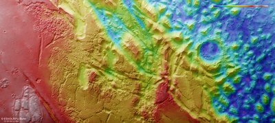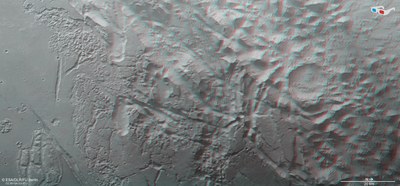 The High Resolution Stereo Camera (HRSC) acquired the data from which these images were created on 31 October 2018 during Mars Express Orbit 18,765. The ground resolution is about 14 metres per pixel and the centre of the imaged area is located at approximately 327 degrees east and 11 degrees south. The colour image was created using data from the nadir channel, the field of view of which is aligned perpendicular to the surface of Mars, and the colour channels of the HRSC. The colour-coded topographic view is based on a Digital Terrain Model (DTM) of the region, from which the topography of the landscape can be derived. The reference body for the HRSC-DTM is a Mars equipotential surface (Areoid). The oblique perspective view was generated from the DTM and data from the nadir and colour channels of HRSC. The anaglyph, which provides a three-dimensional view of the landscape when viewed using red-green or red-blue glasses, was derived from data acquired by the nadir channel and the stereo channels. - The HRSC experiment on Mars Express
