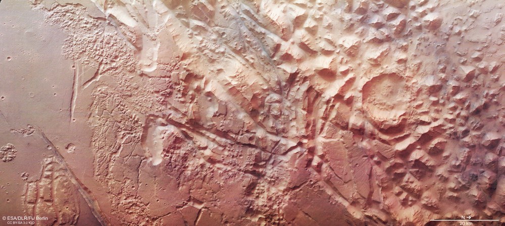 Aurorae Chaos is part of an extensive system of fissures, grabens and hills to the northeast of the vast Valles Marineris canyon system. The bottom of the irregularly shaped depression, which measures up to 600 kilometres across, is approximately four kilometres lower than the surrounding plains. The entire chaos region within Margaritifer Terra covers around 1.6 million square kilometres, making it an extremely imposing landscape. Elsewhere on Mars, the chaotic terrains are significantly smaller, barely exceeding the size of an impact crater.