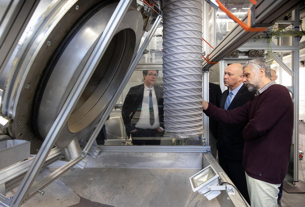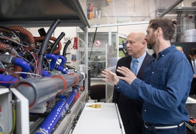 Innovative and flexible gas turbines were the focus of the last stop on their tour for Chris Fall and his delegation. Using the high-pressure combustion chamber test rigs and state-of-the-art measurement technology, researchers at the DLR Institute of Combustion Technology are developing burners and combustion systems for gas turbines such as those used in power plants or for flight operations. They are also developing forward-looking concepts for decentralised energy supply using micro gas turbines.
