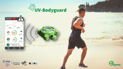 UV-Bodyguard is a wearable containing special UV measurement technology. This wearable is connected to a smartphone via Bluetooth and continuously measures UV radiation intensity. In the corresponding smartphone app, the users enter their skin type and the protection factor of their Sun lotion. Users can see how much 'healthy' time in the Sun they have already used up, how long they can still stay in the Sun, and they will be warned before the onset of sunburn – in real time. The UV-Bodyguard app offers UV prediction for the users' location. The necessary information for this is taken from the portfolio of existing Copernicus data products.