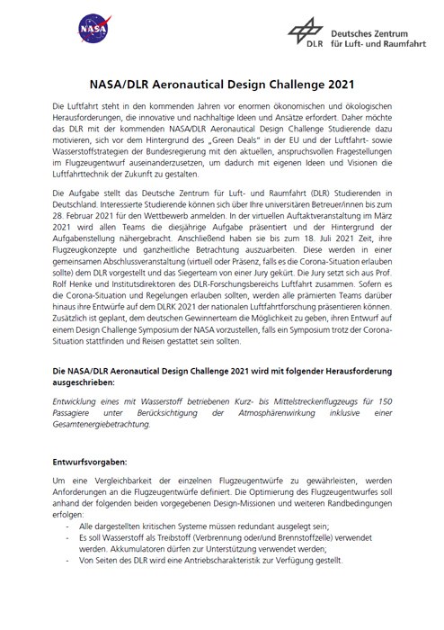 The air transport sector is and will continue to face enormous economic and environmental challenges over the coming years, and these require innovative and sustainable ideas and approaches. In cooperation with the US National Aeronautics and Space Administration (NASA), the German Aerospace Center (DLR) is inviting students to design a hydrogen-powered short- to medium-range aircraft for 150 passengers, taking into account its effects on the atmosphere and including an overall energy analysis.