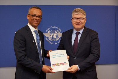 Ibrahim Yimer, Chairman of the International Forum for Aviation Research (IFAR) hands over the ‘Scientific Assessment for Urban Air Mobility’ to Juan Carlos Salazar, Secretary General of the International Civil Aviation Organization (ICAO).