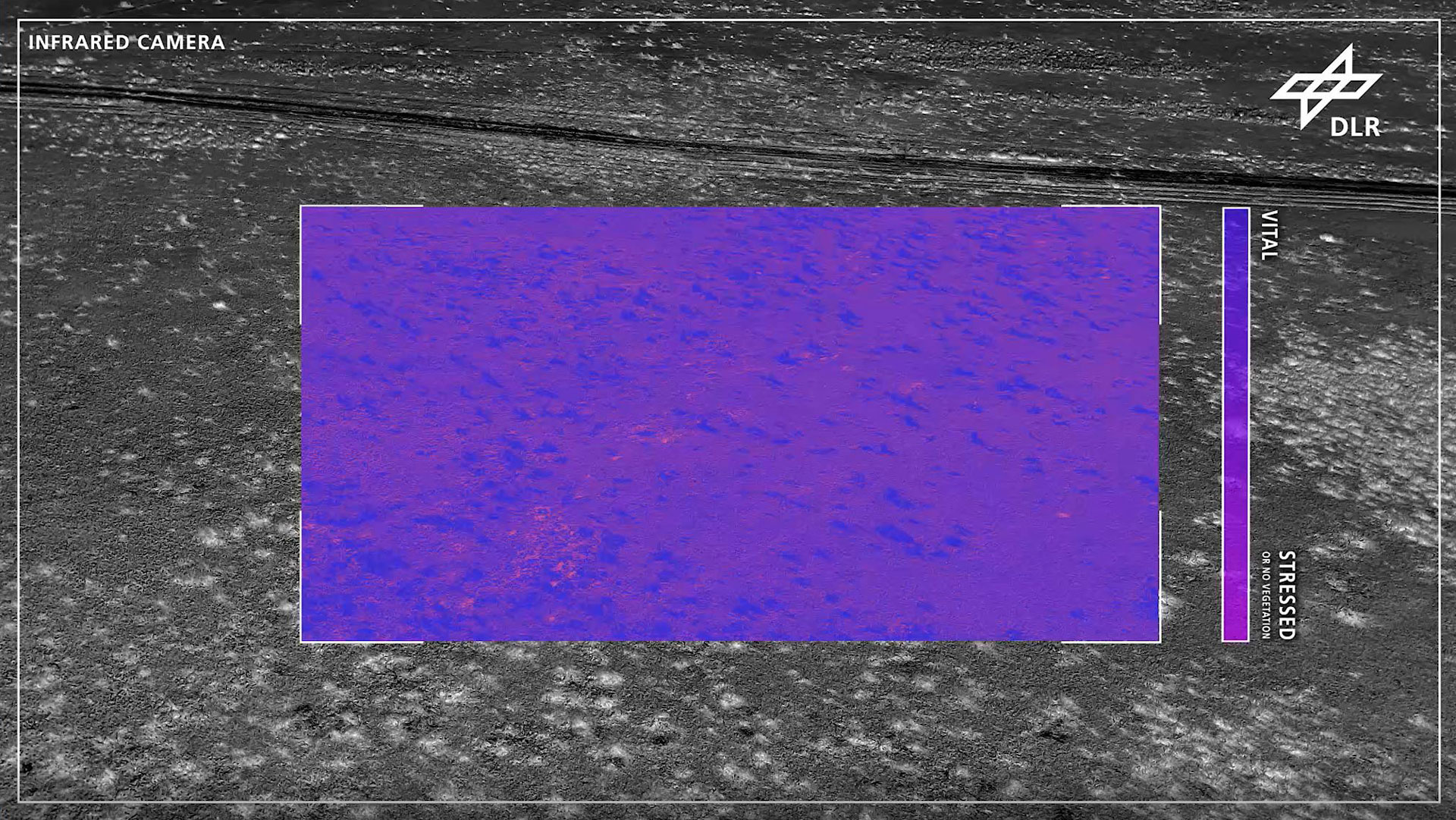 This multispectral camera can observe an area in more detail than the human eye. While a green vital meadow reflects near-infrared, a ‘stressed’ meadow already shows differences. In this case, locusts have attacked the first blades of grass and the chlorophyll content has decreased. This aerial drone survey using a multispectral camera is part of the Locust-Tec project.