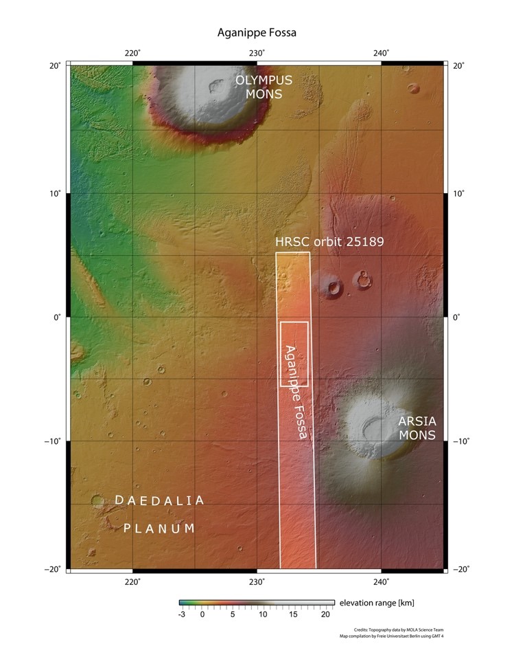 New image data acquired by the High Resolution Stereo Camera (HRSC) on board ESA's Mars Express spacecraft show the northern part of Aganippe Fossa at the foot of the Arsia Mons volcano. HRSC is a camera system developed and operated by the German Aerospace Center (Deutsches Zentrum für Luft- und Raumfahrt; DLR).