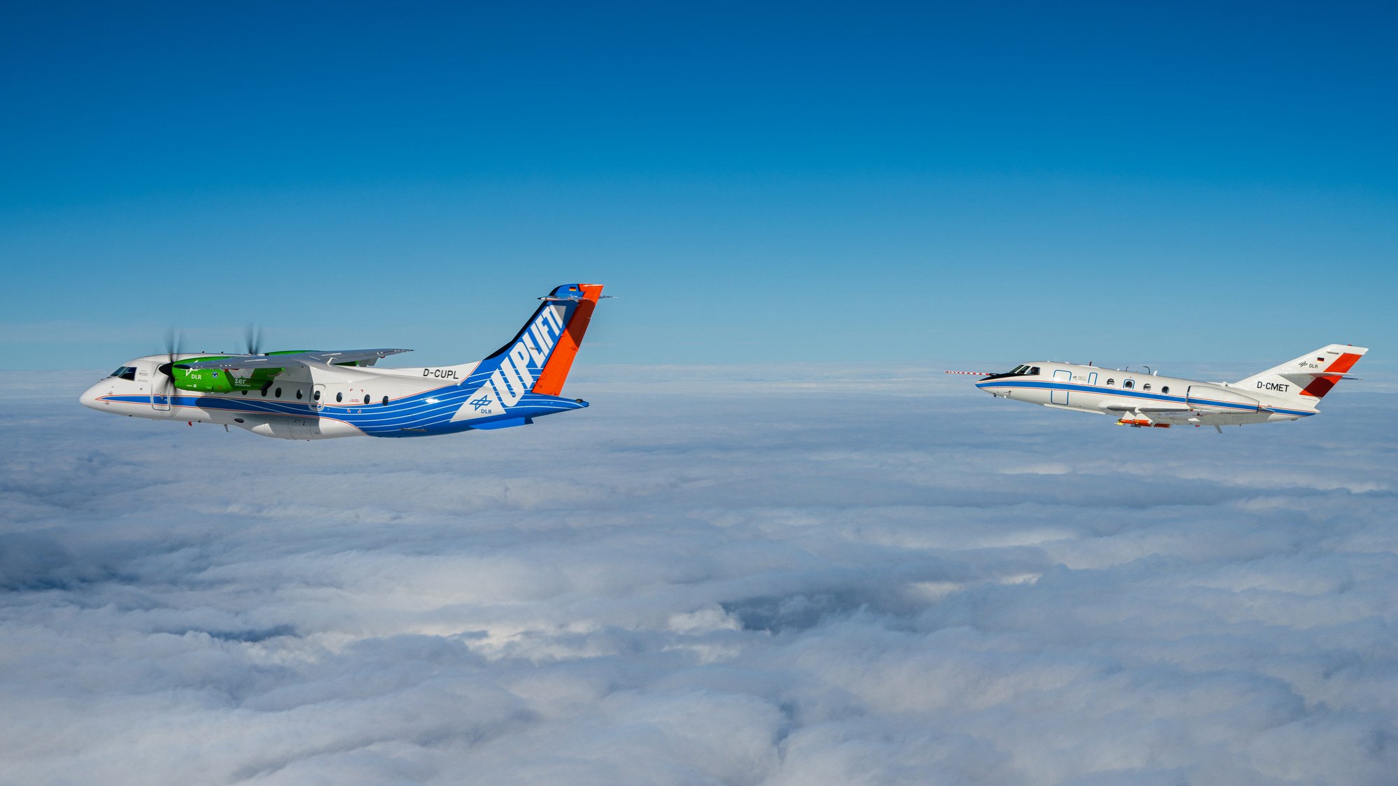 The DLR research aircraft UpLift Dornier 328-100 ‘D-CUPL’ and Dassault Falcon 20E-5 ‘D-CMET’ during a joint measurement flight.