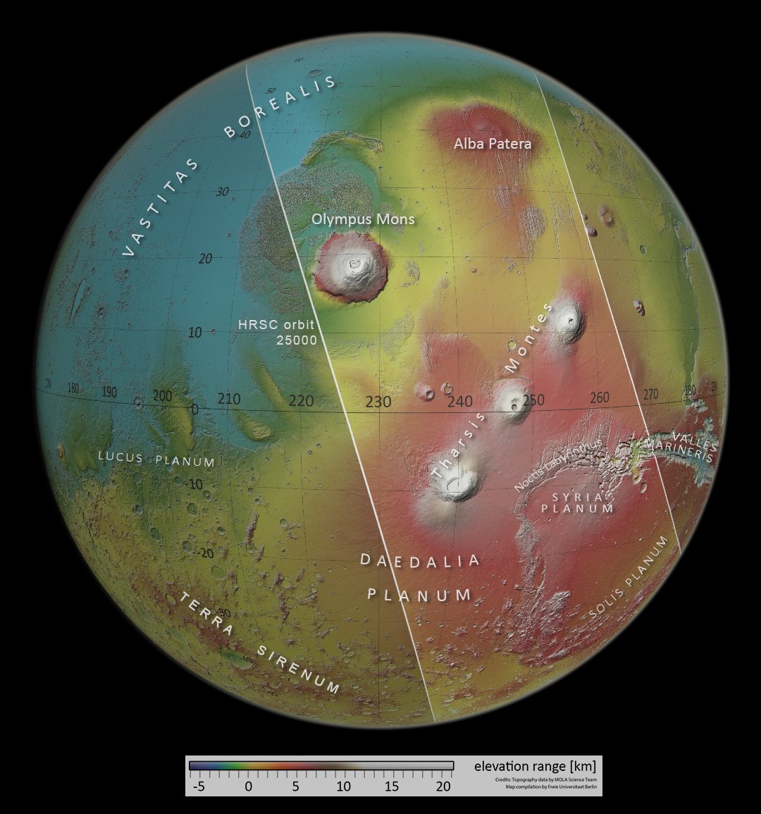 The Tharsis region is a bulge more than four thousand metres high and is roughly the size of North America. It is located at the transition from the southern highlands to the northern lowlands. Its origin has not been conclusively clarified, but the volcanic and tectonic character makes it seem likely that large magma bubbles rising from the planet's mantle have pressed against the brittle crust from below and lifted Tharsis over time. This resulted in volcanoes and enormous expansion structures. In addition to the three striking Tharsis volcanoes (Tharsis Montes) and Olympus Mons, the huge Alba Patera volcanic complex is also part of the Tharsis region. The colour scale for this topographical map illustrates the enormous differences in altitude compared to the surrounding area of Tharsis. The framed box marks the area imaged by Mars Express during orbit 25,000.