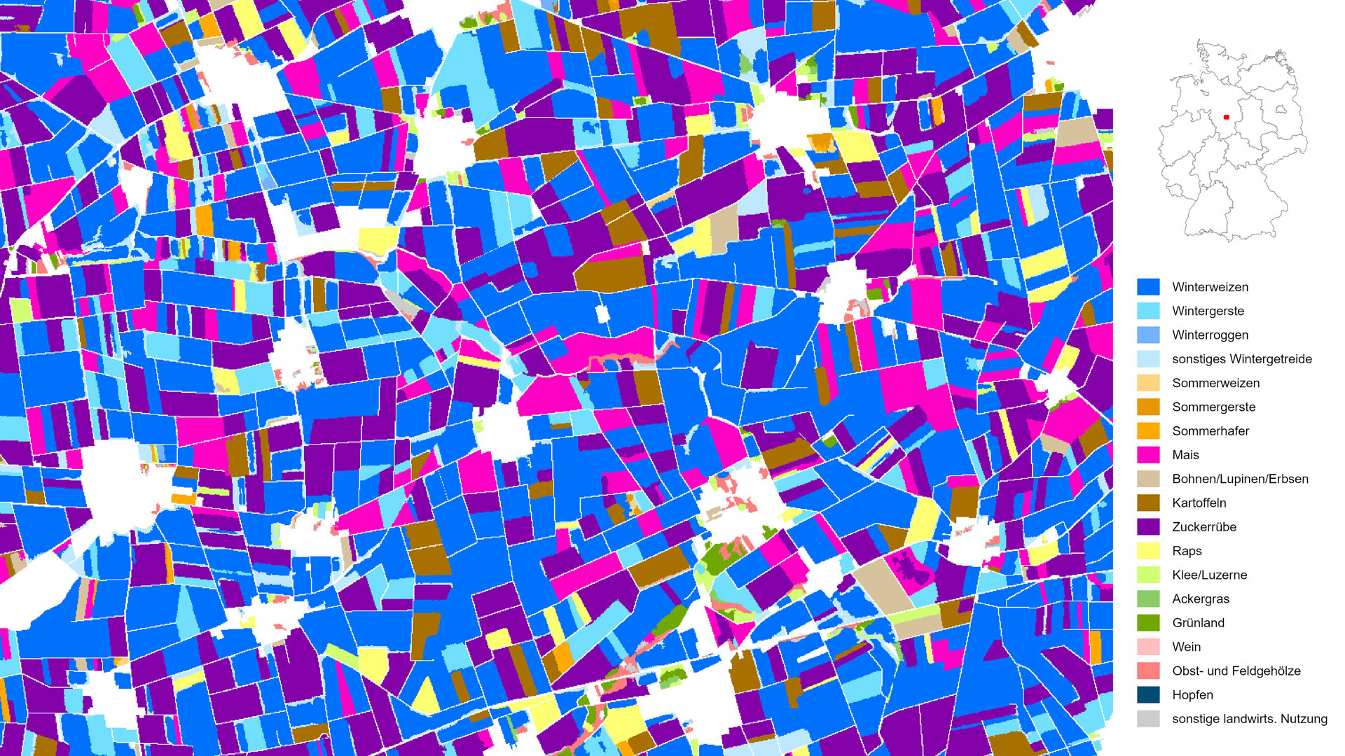 This map depicts types of crops and primary agricultural uses in Germany, at a resolution of ten metres. This image, dating back to 2020, highlights the intensively cultivated agricultural landscape northeast of Hildesheim. The Hildesheim Börde is distinguished by its exceptionally fertile black earth loess soils. The primary arable crops are winter cereals (various shades of blue) and sugar beet (purple), complemented by maize (pink), potatoes (brown) and rapeseed (yellow) as catch crops.