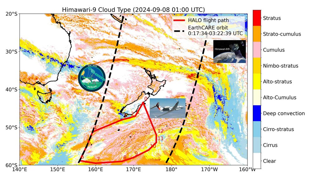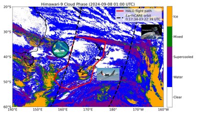 Further support comes from the Japanese Himawari weather satellite. Its data is combined with HALO's flight path and provides real-time information on cloud types and aerosol quantities along the route. This allows flight planners to respond directly to current conditions, such as when warm, supercooled or icy clouds form in a region, or when cloud-free areas present opportunities for aerosol measurements.