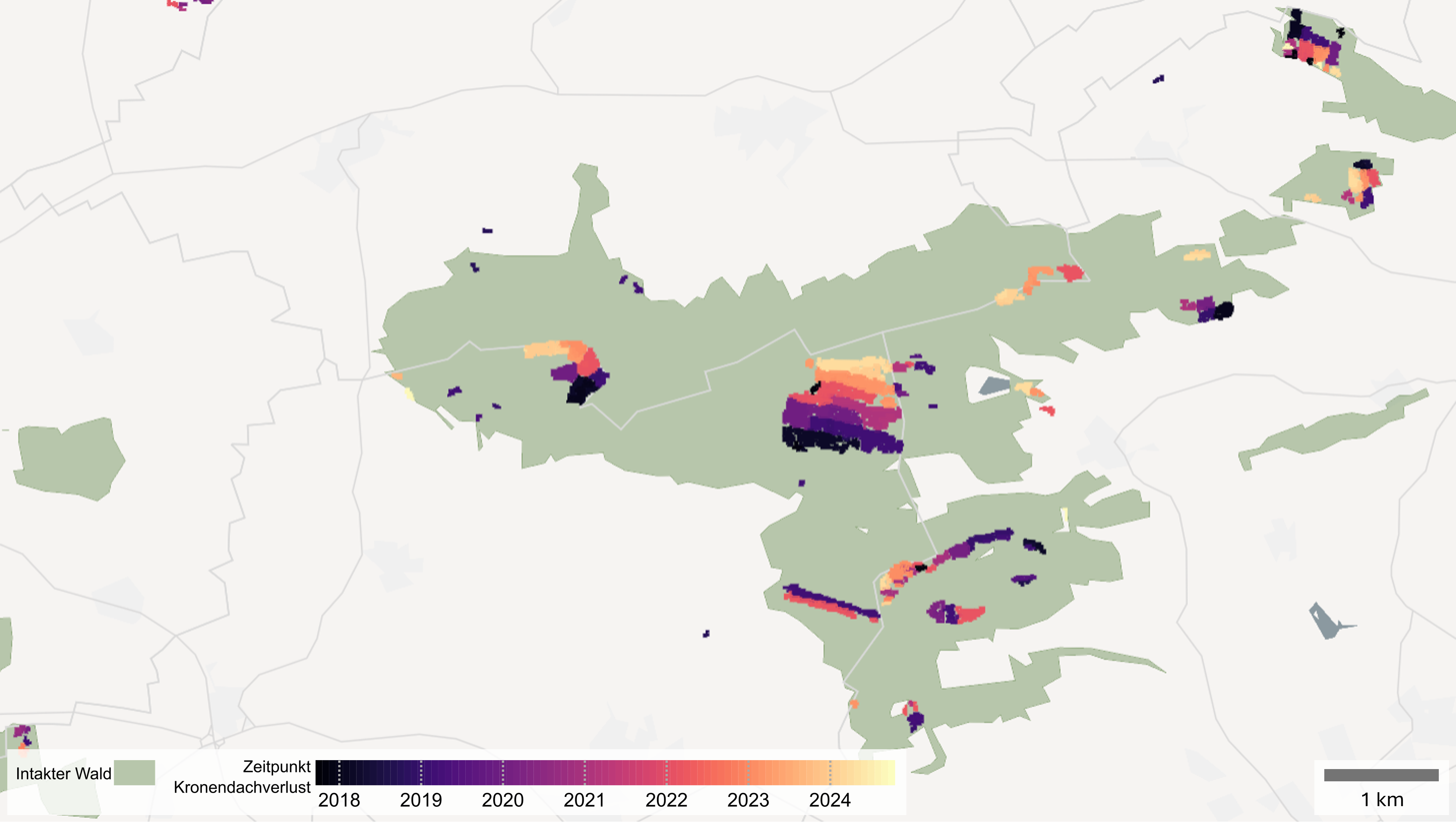 Data from the EO Wald web service reveals a 'coppice-with-standards' (CWS) management system in the oakwoods of Bavaria's Franconia region. This is a traditional form of woodland management rarely practised today, but one that allows firewood and timber to grow in the same area at the same time. CWS woodlands usually consist of two layers of vegetation: an overstory – trees that are left to age – and an understory which is regularly harvested. Coppicing (felling) normally takes place in winter. The resulting sparse forest structures – identifiable here as continuous stripes – may look unusual but play an important role in nature and species conservation. Select trees, often those that have grown nicely, are left standing. These one-off giants are not visible in the dataset, but over the course of a century evolve into mighty overstory of the CWS woodland.