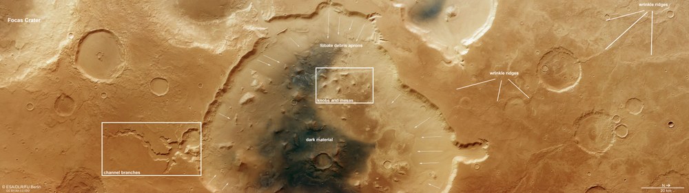 The area surrounding the depression also presents a diverse landscape – small and large craters (such as the 75-kilometre-wide Focas crater in the southwest, visible on the right in the overhead image) and wrinkle ridges are prominent features. The latter indicate lava flows that cooled and contracted. While the surrounding terrain dates back to the Noachian period, the depression itself shows multiple features indicating more recent geological activity. HRSC images reveal that parts of the crater rim have been eroded. Particularly in the southern part of the depression, branching channels are visible, likely formed by groundwater seeping to the surface.