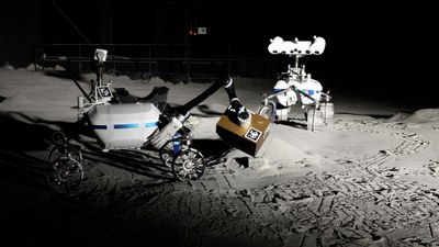 LRU1 and LRU2 are familiar with rough terrain – they have already proven themselves in training missions on Mount Etna in Italy. As part of the ARCHES mission, LRU1 and LRU2 explored the area and collected samples, working alongside other robots. "In the LUNA hall, the rovers have navigated autonomously, avoided obstacles and selected and used the appropriate instruments. All of our goals in the Polar Explorer campaign were achieved," says Martin Görner from the DLR Institute of Robotics and Mechatronics. The rovers also coped well with the difficult lighting conditions, simulating the polar regions of the Moon, where the Sun is always low on the horizon and dazzles the camera systems. A Sun simulator in the LUNA hall recreates this effect.