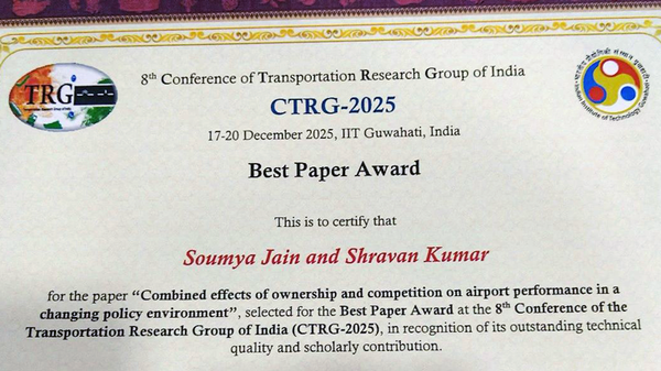 A study co-authored by Dr Soumya Jain (IIT Delhi) and Dr Shravana Kumar (DLR Institute of Air Transport) received the Best Paper Award in transport planning at the 8th Conference of the Transportation Research Group of India (CTRG 2025) in Guwahati, India. The study examines the efficiency of Indian airports in the context of ownership structures, competition and policy frameworks.
