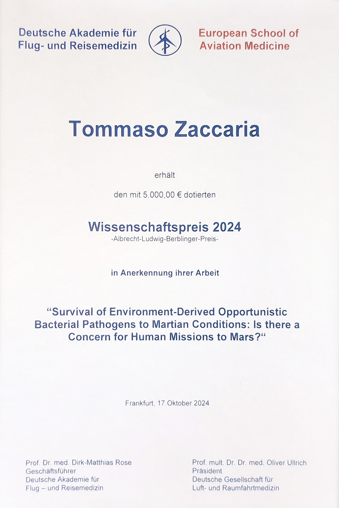 - Albrecht Berblinger Prize recognises Tommaso Zaccarias publication on the resilience of bacterial pathogens under Martian conditions and the potential implications for human missions to Mars