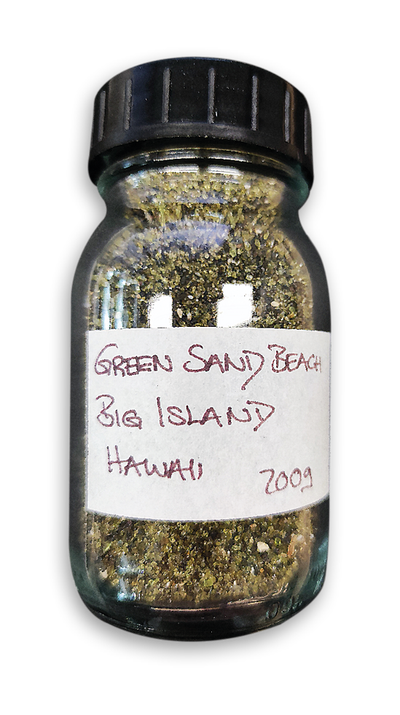 Oh, that is an easy question. It is from Hawaii, and I love it because the sand is green. It consists primarily of the volcanic mineral olivine. The sand is found at Green Sand Beach, a well-known place on the Big Island. This beach is quite difficult to get to. We walked through the heat for almost two hours and suffered many blisters. But then this cliff opened up before us, revealing a picture-perfect beach made of green sand. I had never seen anything like it before.