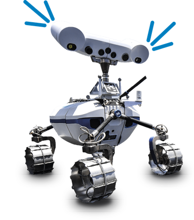 In this team, LRU1 is the scientist. It begins a mission by looking around, seeking out promising positions. The three cameras in the middle of its head perform a task similar to human eyes. Two of them form a greyscale stereo camera system, while the other is a colour camera. LRU1 uses them to see in three dimensions and pinpoint its location. "One particular challenge is recognising previously visited places in the grey volcanic landscape and orienting itself accordingly," explains Martin Schuster of the Institute of Robotics and Mechatronics. A fourth camera has a telephoto lens for longer distances, while a thermal camera measures temperature differences. The two exterior cameras enable LRU1 to perceive different frequency ranges using filter wheels. "For instance, it can distinguish between rock types that look the same to humans," Schuster says. The large filter wheels give the LRU1 its characteristic head shape.