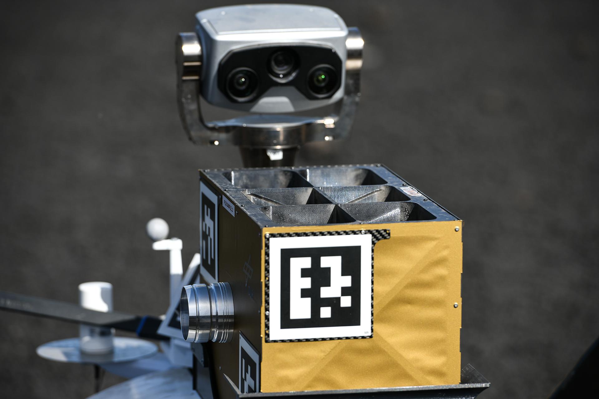 The black-and-white markings serve as name tags. The robots recognise each other and identify their payload. Here LRU2 is carrying a box to hold rock samples.