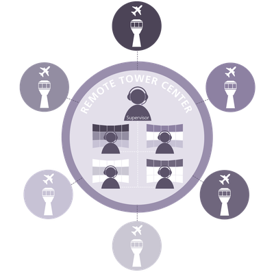 The sensor data from several airports and airfields come together in a remote tower centre. The centre is home to a pool of controllers who are responsible for air traffic control. In the Single Remote Tower concept, one person controls one airport; with Multiple Remote Towers, one person can control several airports. A supervisor monitors and distributes the workload.