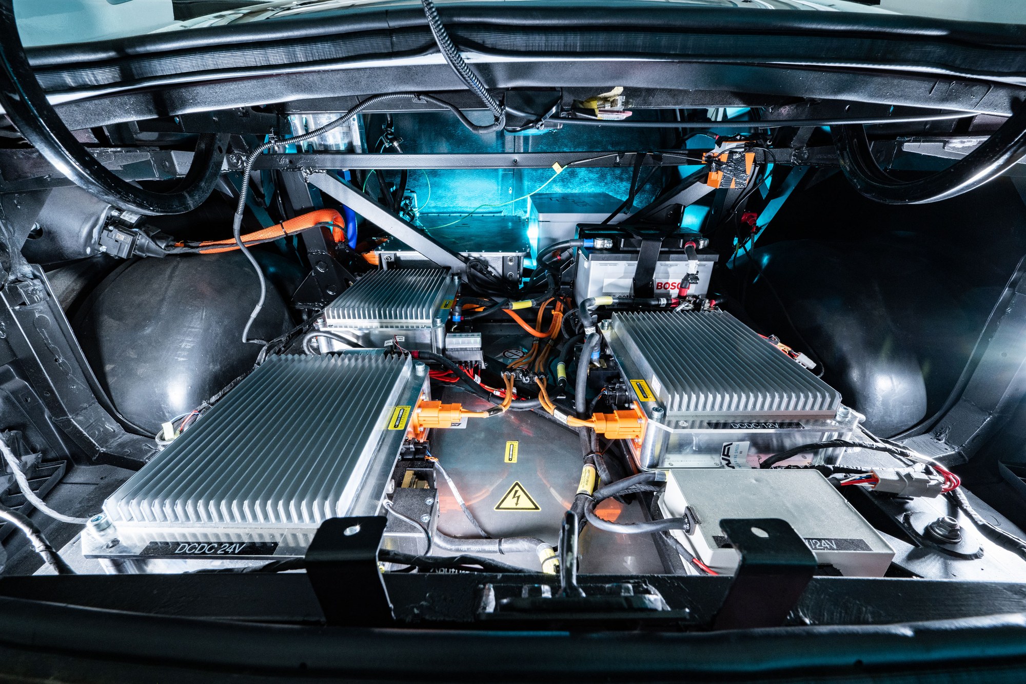 The battery, the power electronics and the DC converter for the power supply are installed here.