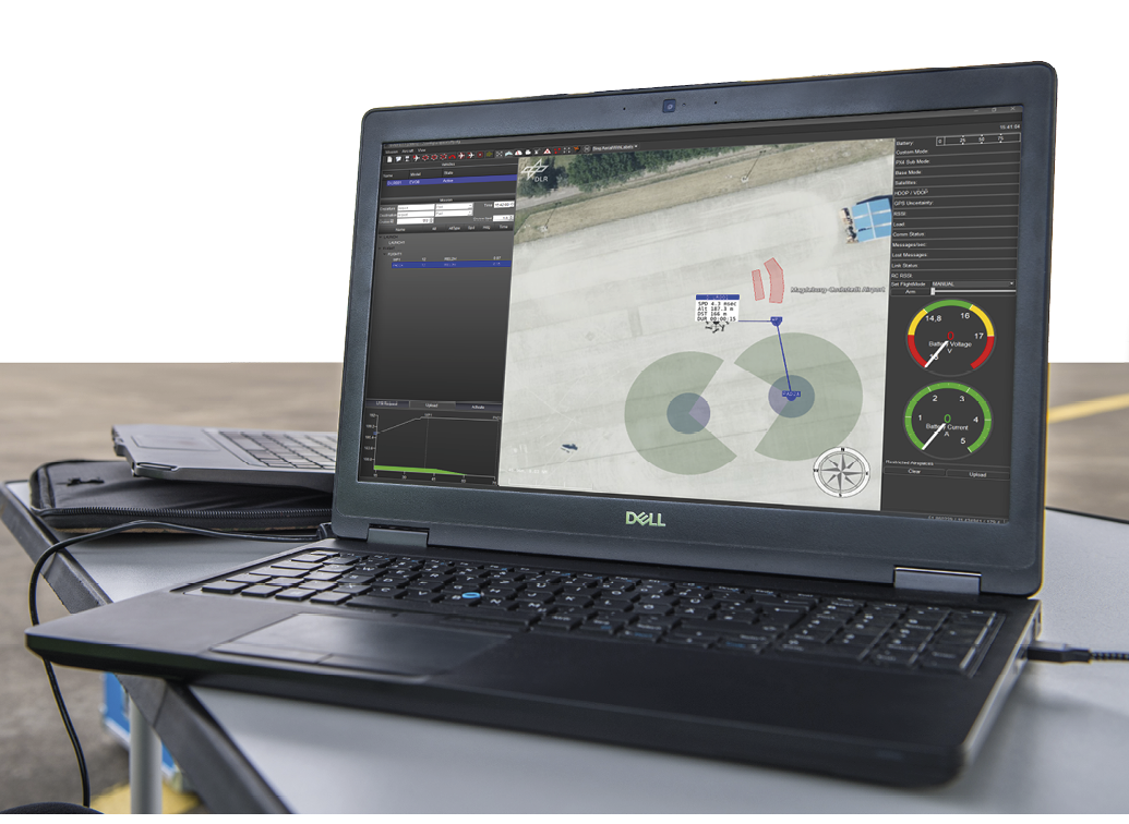View of the U-Fly software developed by the DLR Institute of Flight Guidance. The software is used to control and monitor unmanned aerial vehicles (smaller unmanned aerial vehicles (UAV) or air taxis). It can be used to plan routes or approve or reroute flights.