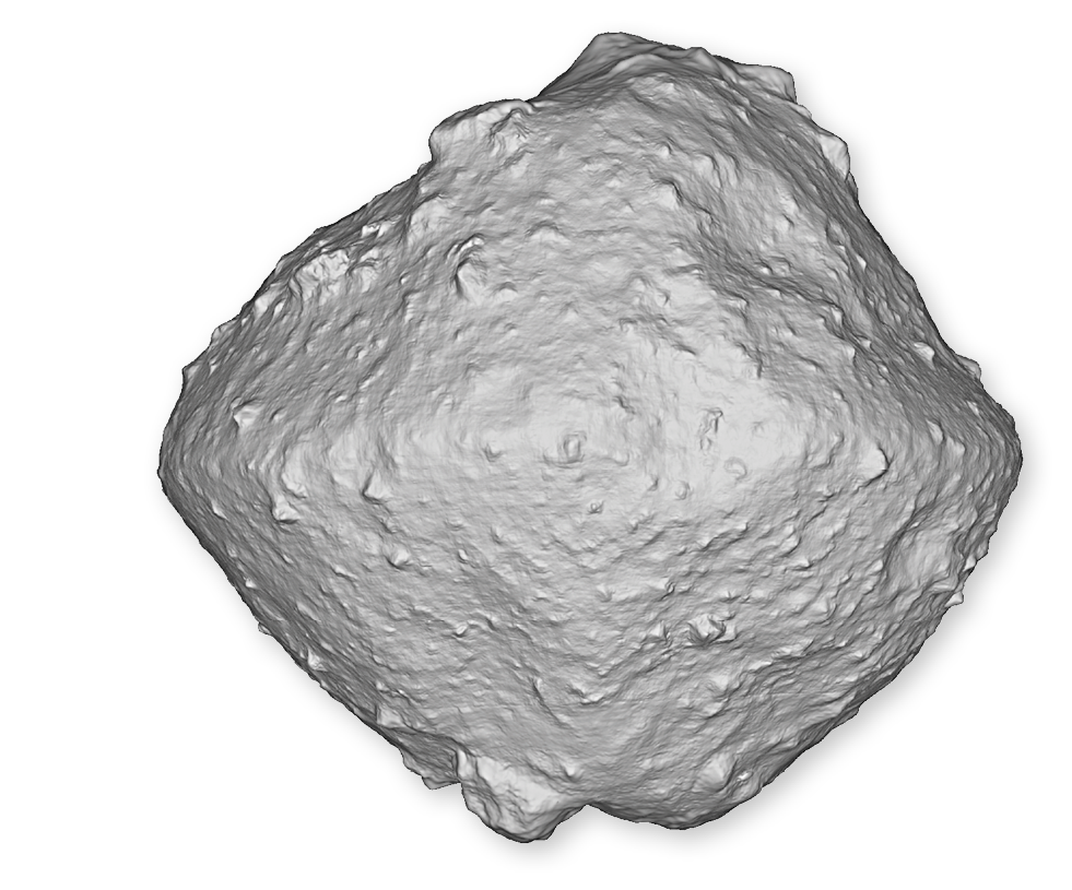 The target of the Hayabusa2 mission was discovered on 10 May 1999 by the LINEAR project, run by the Massachusetts Institute of Technology's Lincoln Laboratory for the systematic detection and tracking of near-Earth objects. It has a diameter of around 900 metres and a shape reminiscent of a rough diamond with eight faces – although, its northern and southern hemispheres are almost round. Ryugu is a carbon-rich 'C'-type asteroid with a mass of about half a billion tonnes. With a density of 1.2 grams per cubic centimetre, Ryugu is very light and probably full of cavities. Asteroids of this size tend not to be made up of caked rock units, but are held together loosely due to gravity – a 'rubble pile'. Ryugu orbits the Sun every 475 days, during which the asteroid intersects with Earth's orbit twice. Ryugu does not pass dangerously close to Earth.