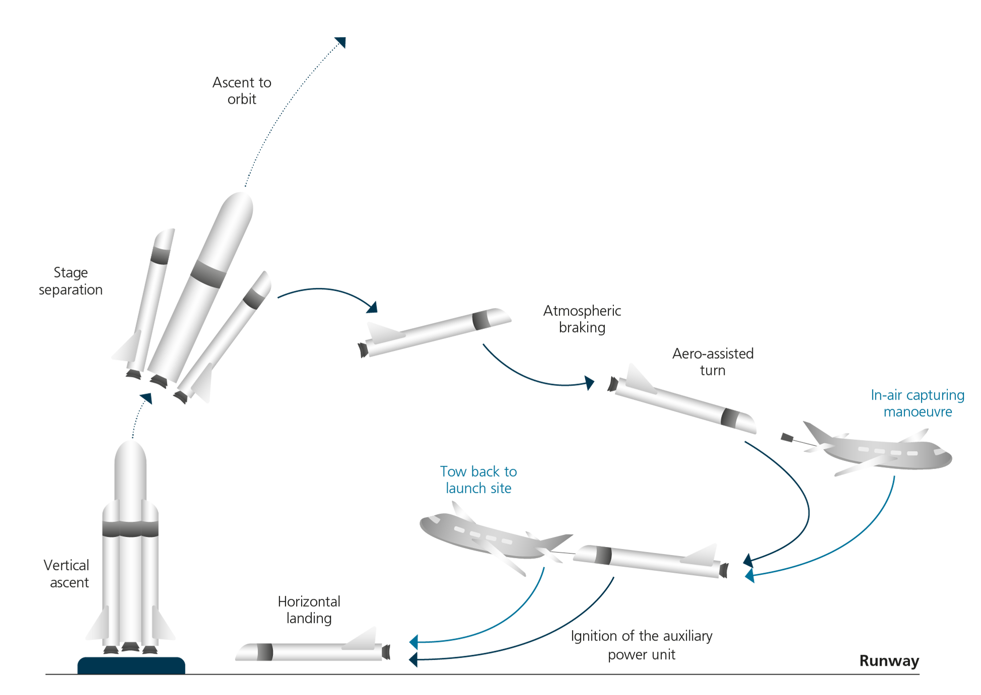When landing horizontally, the rocket stage touches down on a runway, much like an aircraft. The wings also play a crucial role in reducing loads during re-entry without the need for rocket propulsion. There are two main recovery options for horizontally landing systems: 'in-air capturing' (shown in blue) and fly-back. In-air capturing is a DLR-patented technology developed through 2022 as part of the EU Horizon 2020 project called FALcon (Formation flight for in-Air Launcher 1st stage Capturing demonstration). This method involves a towing aircraft positioned in the planned capture area while the winged stage performs an atmospheric re-entry, transitioning into a subsonic glide. The towing aircraft, equipped with a capture device attached to a rope, positions itself in formation flight so the stage can dock with the capture device. After a successful docking, the stage is towed by the aircraft to a runway near the rocket launch site. It is then undocked in mid-air and lands autonomously, similar to a glider or the Space Shuttle. The fly-back method involves equipping the reusable stage with its own aircraft engines, which are activated during subsonic flight.