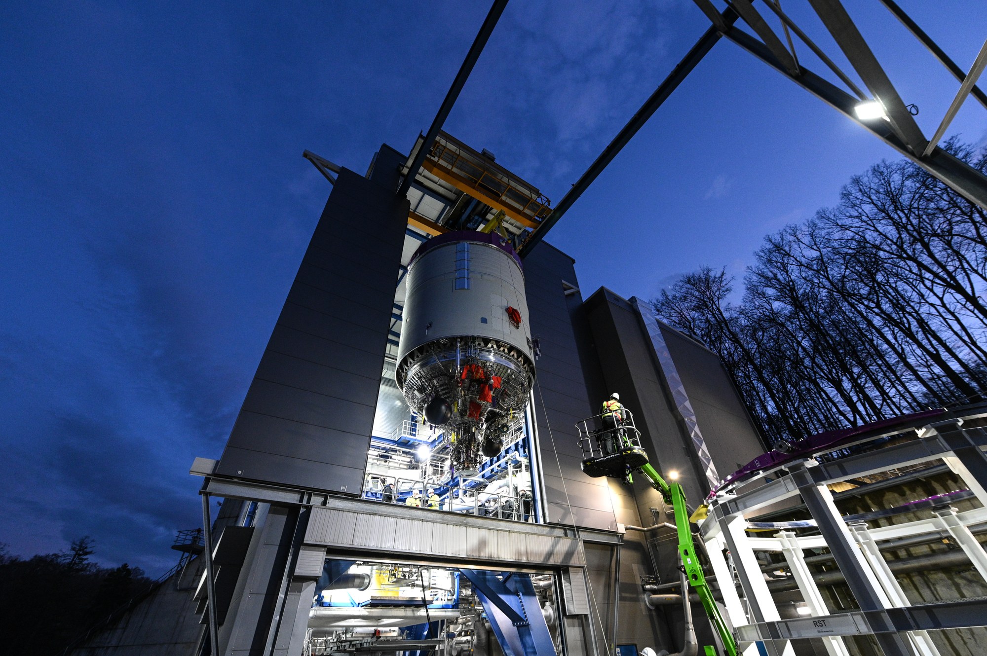 The Ariane 6 upper stage during installation in test stand P5.2 at the DLR site in Lampoldshausen