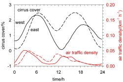 The satellite measurements and traffic data were used to derive the mean diurnal cycles of cirrus cover and air traffic density. Both show a double wave in time with maxima at early morning and early afternoon.