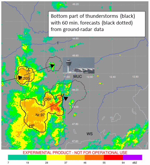 The novel system “WxFUSION” for forecasting thunderstorms has been developed at the department of cloud physics and traffic meteorology of the Institute of Atmospheric Physics. The technology uses satellite and ground-based radar data to identify, track and forecast thunderstorms up to one hour. In addition, the system automatically sends thunderstorm warnings via email as soon as a thunderstorm is detected within 100 km of a chosen location, e.g. an airport. Overall, the new technology contributes to increase safety and efficiency in aviation. The high temporal and spatial resolution of the thunderstorm information, every 5th minute and every 1km at best, and output in an international standard format aiming at a small data volume are considerable benefits for the users. This allows the data also to be transmitted into the cockpit of aircraft via data link technology.