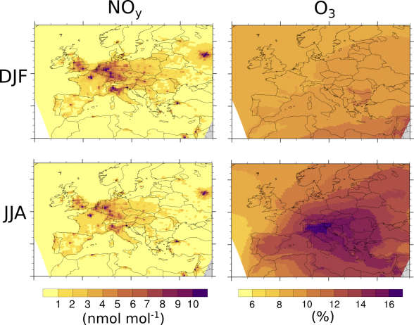 Absolute contribution (nmol mol-1) of land transport emissions to ground-level reactive nitrogen (NOy) during Winter (DJF) and summer (JJA). Right: Relative contribution (%) of land transport emissions to ground-level ozone. (Graphics: DLR, CC-BY3.0) |