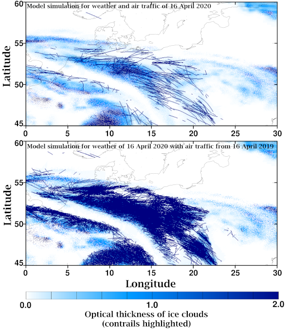The researchers compared the satellite measurements with a model developed at the DLR Institute of Atmospheric Physics, which calculates the coverage from natural clouds and cirrus clouds produced by aircraft contrails, based on current air traffic movements and weather data. The findings based on the satellite imagery are largely consistent with the model data, and the model reflects the regional structures and gives a good representation of the measured values of the optical thicknesses of clouds. In addition, the scientists used the model to calculate a scenario with an air traffic volume 10 times higher, based on air traffic data on the same day in 2019, with the meteorological conditions kept the same in order to pinpoint the effect of different traffic levels. The calculations clearly show far greater coverage from contrail cirrus clouds, with an increased optical thickness of the ice clouds. Weighted with the optical thicknesses, the degree of coverage of the partially overlapping contrails would be four times greater.