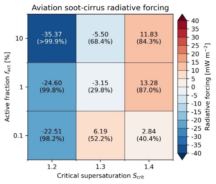 The model describes the ice-forming ability of aerosol particles with two parameters: the critical supersaturation at which ice formation is triggered (Scrit), and the activated fraction of the aerosol population that effectively forms ice (fact). Based on previous studies and the results of laboratory experiments, these two parameters were varied over a range of possible values. A total of nine numerical experiments were conducted to illuminate the corresponding parameter space. Using this method, radiative forcing caused by the airborne effect on cirrus was quantified in the range of -35 to +13 mW m-2, but with a confidence level below 95% in several cases. Compared to this, the effect of CO2 from aviation is about +34 mW m-2 according to latest estimates (referring to the year 2018).
